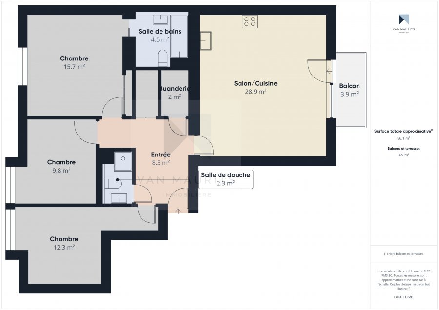 Situé à Luxembourg-Kirchberg (1A, rue de Kirchberg), au 2ième étage de la résidence «Les Terrasses du Soleil» datant de 1993, cet appartement d'une surface habitable de ± 90 m² pour une surface totale de ± 108 m² se compose comme suit:Un hall d'entrée de ± 9 m² dessert un séjour salon/salle à manger/cuisine de ± 29 m² avec accès à un balcon de ± 4 m², 2 chambres de ± 9 et 11 m², une salle de bain de ± 3 m², une chambre de ± 21 m² avec salle de douche séparé de ± 5 m², une buanderie de ± 2 m² et un débarras ± 1 m².