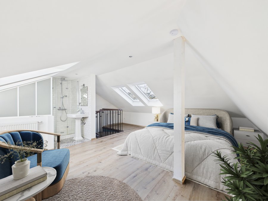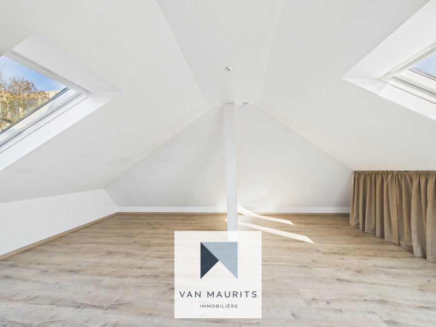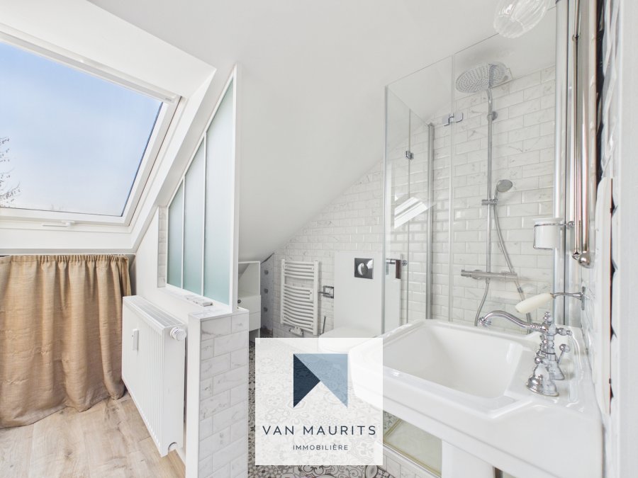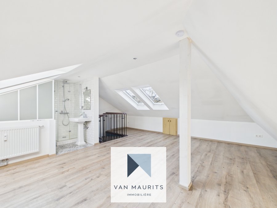 Au 3ème étage : une chambre de ± 16m² (37m² au sol avec placards intégrés) avec une salle de douche (douche, lavabo, sèche-serviettes, WC)