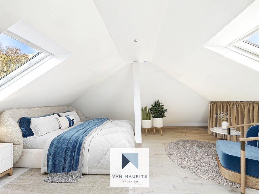 Au 2ème étage : la porte d'entrée s'ouvre sur un hall de ± 3 m² et dessert une première chambre de ± 11m² ; la salle de bain de ± 5m² (baignoire, double vasque, séche-serviettes et wc) ; l'espace de vie de ± 29 m² composée d'une partie salon, salle à manger et cuisine équipée ; sous la cage d'escalier un coin bureau.