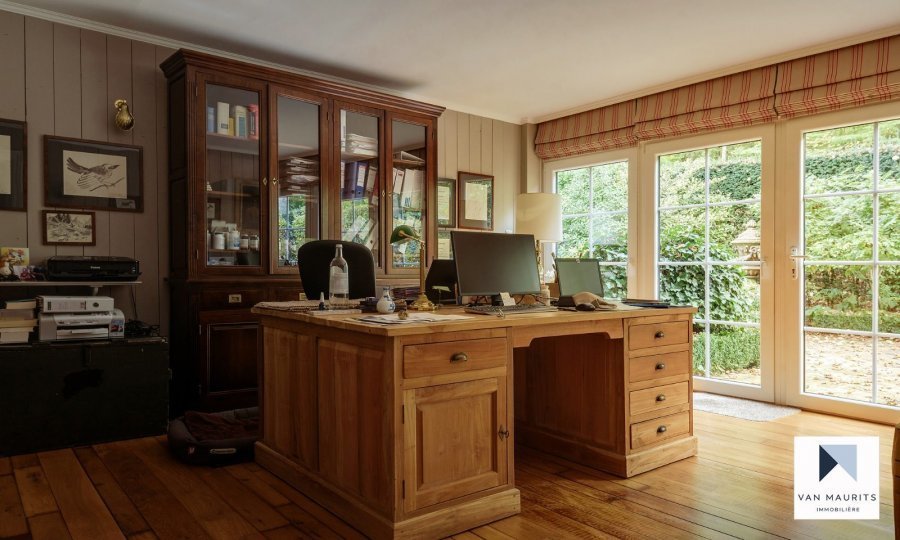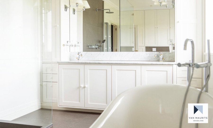 Au rez-de-chaussée, un hall d’entrée cathédrale (+/- 30 m2), entièrement vitré et d’une hauteur de 5,8 mètres, conduit au salon (+/- 55 m2), disposant d’un feu ouvert et à la cuisine avec son îlot central (+/- 22 m2), ouverte sur un jardin d’hiver – salle à manger, lequel s’ouvre sur une terrasse de 68 m2. Le confort de ce niveau est accentué par une arrière-cuisine, buanderie et un vaste dressing. Un spacieux bureau, avec une entrée séparée, permet de recevoir de manière autonome clients ou fournisseurs.